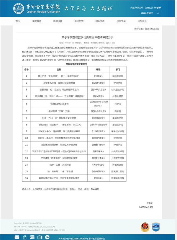 据了解,此次评选活动学院各个单位积极参与,共上报在线教学案例29个,经过专家评议遴选,最终16个教学案例被评为学院“在线教学优秀案例”。