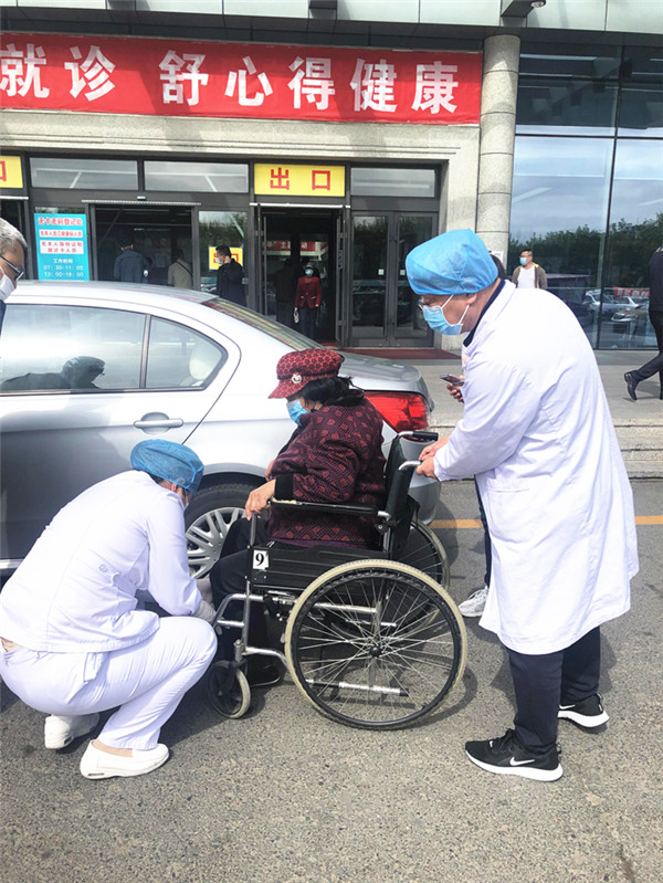 为行动不便者送轮椅 志愿者及医务人员主动为就诊者服务